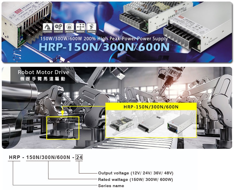 MEAN WELL HRP series have been selling well in the industrial control field for many years because of ultra-high performance and a 5-year long warranty. This year, we specially selected the common power and voltage used for driving motors and developed the HRP-150N/300N/600N series. Output voltages include 12V/24V/36V/48V. Combined with 200% high peak power, they can meet the instant peak power demand of electromechanical equipment.