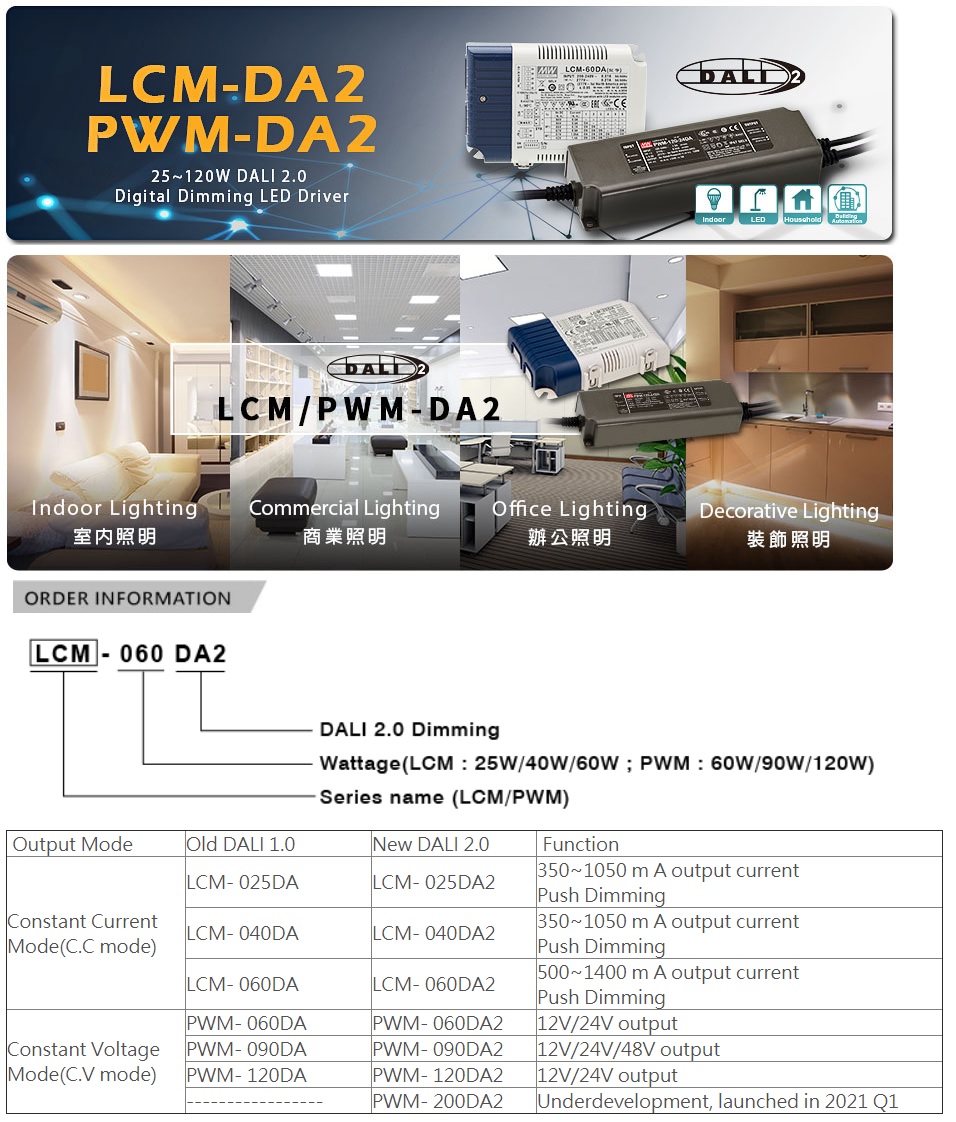 For the indoor DALI dimming solution, MEAN WELL improved the product functions and launched products that comply with DALI 2.0 regulations, including LCM-DA2 series and PWM-DA2 series.