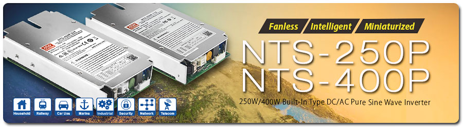 MEAN WELL’s first-generation TS family has been on the market for 14 years since its launch in 2006. In order to meet market demand for more cost-effective inverters, MEAN WELL has planned a new-generation NTS/NTU family of 250W~3200W inverters. The first products to be launched are the MEAN WELL pioneered built-in type DC-AC pure sine wave inverters, the NTS-250P/400P series.