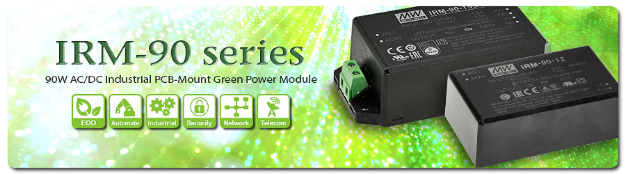 Since released in 2014, the MEAN WELL 1~60W IRM AC/DC green power modules were well received by the market and sold over millions of units each year. They are suitable for IoT, handheld instruments, communication equipment, household appliances, and etc. In order to fulfill the higher wattage demands from the market, MEAN WELL now announces the 90W IRM-90 series, which can also be directly mounted and soldered onto the PCB. Additionally, the IRM-90-xST screw terminal type can offer alternative mounting and wiring options.