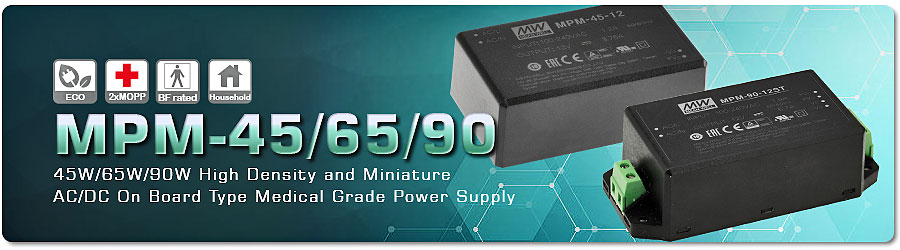 The MPM-45/65/90’s main features include: miniature size, meeting EN55011 Class B EMI performance without external components, ultra-low no load power consumption < 0.1W, 93% high efficiency, -30~+80℃ wide operating temperature, compliance to latest edition of IEC/EN60601-1 and ANSI/AAMI ES60601-1 medical safety standards, 2xMOPP isolation level, and low leakage current <100μA. The products are suitable for type BF medical equipment, such as medical diagnostic equipment, portable medical instruments, or medical equipment that requires ultra-low standby power consumption.