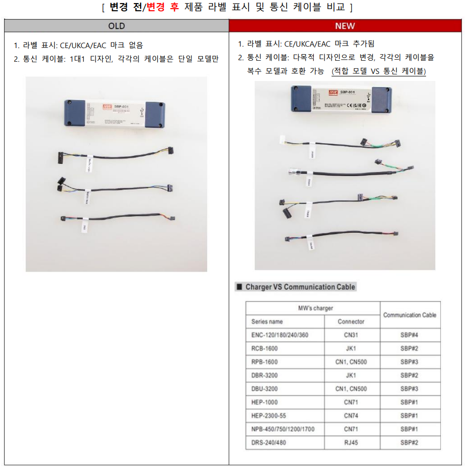 각각 새로운 모델마다 케이블을 추가하지 않기 위해 여러 모델과 호환 가능하도록 통신 케이블을 통합하고 있습니다. 이에 더해, EMC 레포트가 업데이트 되었으며, SBP-001제품 라벨에 CE /UKCA/EAC 마크가 추가될 예정입니다. 변경사항에 대한 세부 내용은 아래 표를 참조하시기 바랍니다.