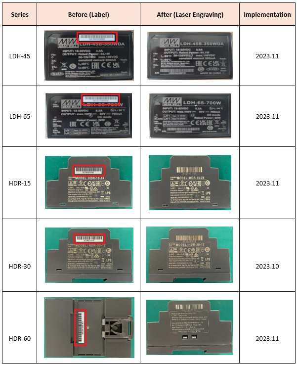 이번에는 LED 전원 공급 장치 LDH-45/65 시리즈와 DIN Rail 전원 공급 장치인 HDR-15/30/60 series의 라벨이 변경됩니다.