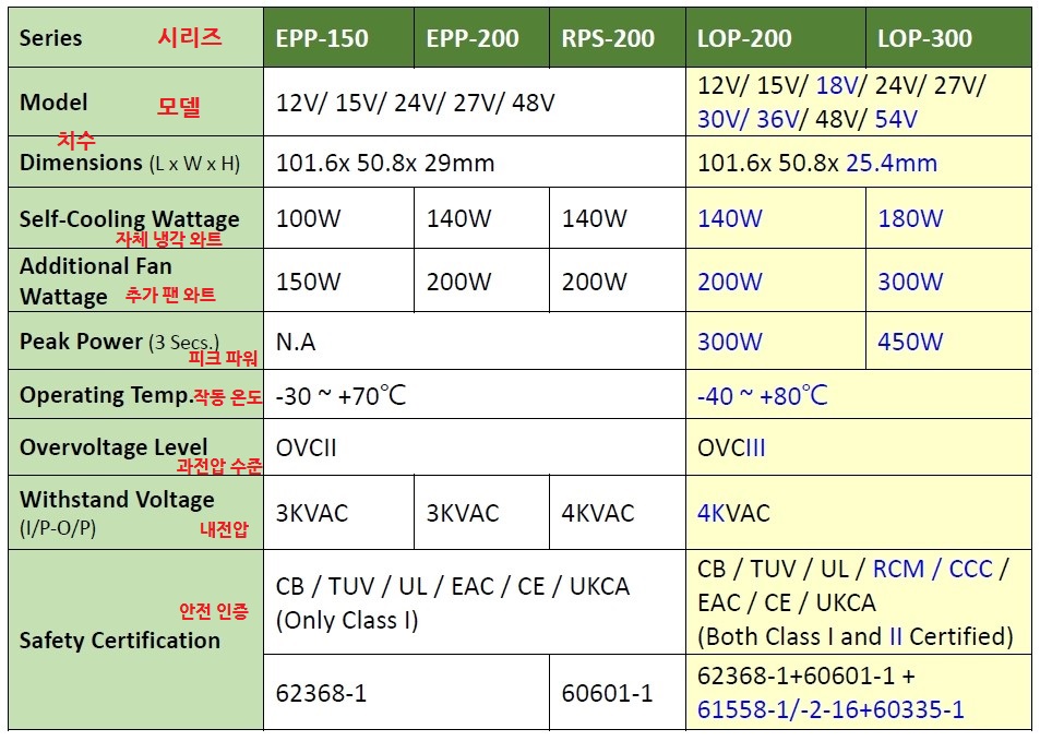 현재 판매 중인 LOP-200/300과 EPP-150/200, RPS-200 모델의 주요 차이점은 아래 표에 자세히 나와 있습니다. 이러한 차이에는 더 얇은 프로필(1" 높이), 더 포괄적인 12-54V 전압 범위, 4" x 2" 크기 내에서 최대 300W증가된 전력 출력, 3초 동안 150% 부하 용량, -40에서+80°C의 더 넓은 작동 온도 범위, OVCIII 준수 및 62368-1/6060601-1/61558-1/60335-1과 같은 다양한 안전 표준을 동시에 준수하는 것이 포함되어 있습니다. 이러한 인증을 통해 ITE장비, 의료 기기, 공장 자동화, 가정용 기기 등을 포함한 광범위한 응용 분야에 적합합니다.