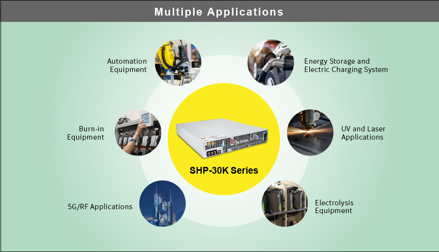 이전 SHP-10K 시리즈의 확장으로, SHP-30K는 와트 수를 증가시킴으로써 고객 요구를 충족시키는 뿐만 아니라 출력 병렬 기능을 최대 >300KW까지 향상시키고, 완전한 프로그램 가능한 출력 전압 (PV) 및 전류 (PC) 제어 기능을 제공하며, 내장형 CAN Bus 통신 프로토콜 (옵션으로 PMBus 또는 Modbus)을 제공합니다.