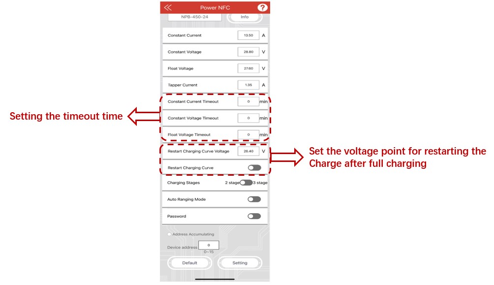 [Figure 2]와 같이 모바일 앱 인터페이스를 통해 설정할 수 있는 정전류(CC), 정전압(CV), 부동전압(FV), 세류전류(TC) 등의 기본 파라미터 외에도 충전 곡선 타임아웃 기능, 만충전 도달 후 충전 재활성화 기능 등을 설정할 수 있는 옵션도 있습니다. 또한 보안을 위한 패스워드 기능을 갖추고 있습니다.