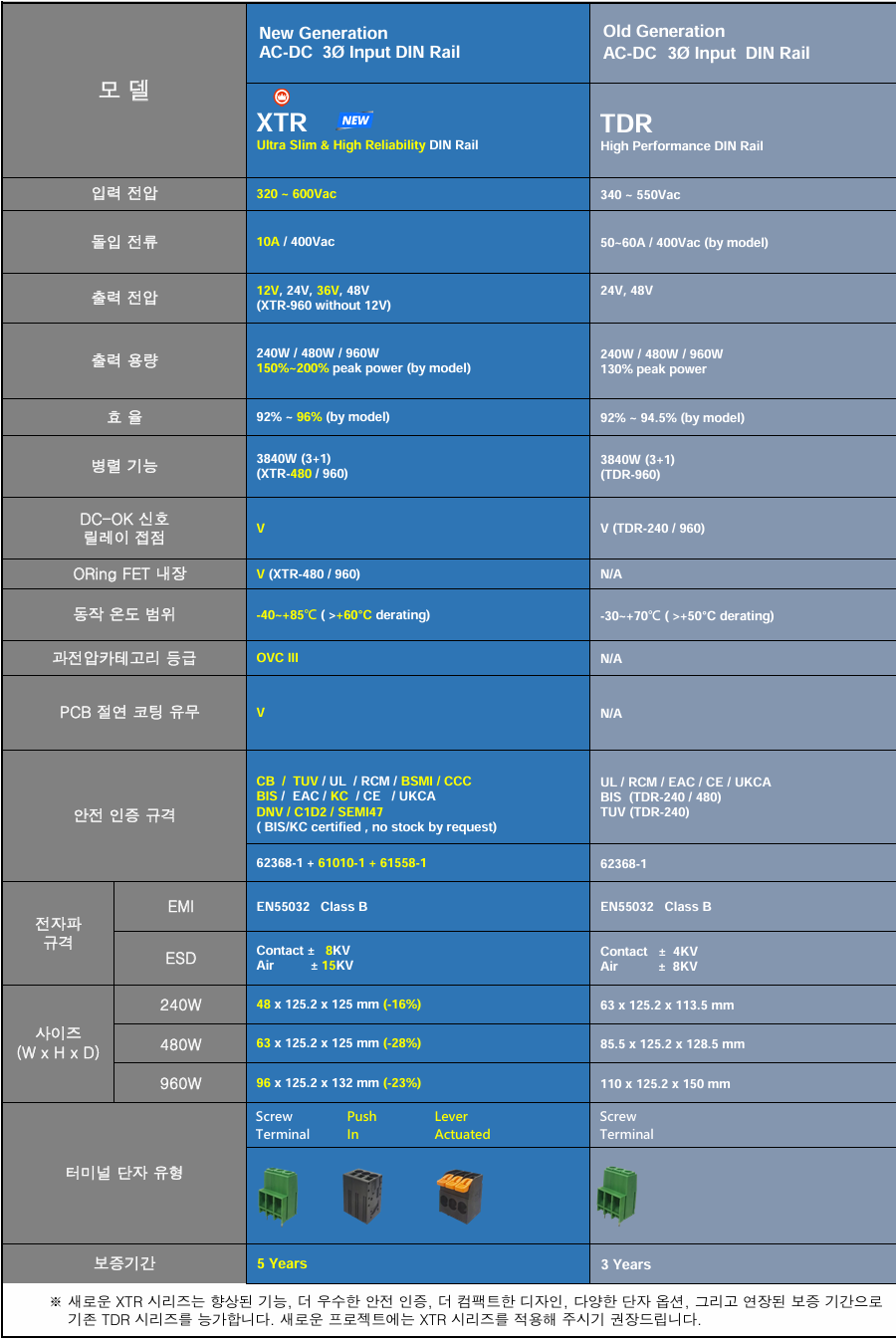 [신제품] XTR 시리즈 : 240W / 480W / 960W 차세대 3상 입력 초슬림, 고효율, 내구성 DIN레일형 파워서플라이