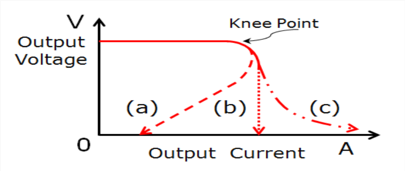 과부하 시 전류는 정의된 범위 내에 유지되고, 출력전압은 도면의 곡선 b 와 같이 떨어집니다.