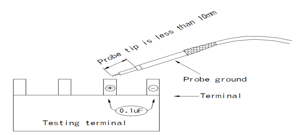 직류전압에는 Ripple & Noise 라고 알려진 두 종류의 AC 성분이 함유되어 있습니다. 한 가지는 사인파 정류로부터 나온것으로 입력주파수의 2 배정도의 저주파수이고, 다른 하나는 스위칭 주파수로부터 나온 고주파수입니다. 고주파 노이즈를 측정하기 위해선, 오실로스코프의 설정을 20MHz 대역으로 하여야 하고, 스코프의 probe 를 가능한 짧게 해야 하며, 노이즈 간섭을 필터링하기 위해 병렬로 연결된 0.1uF 와 47uF 의 캐패시터 추가해야 합니다.