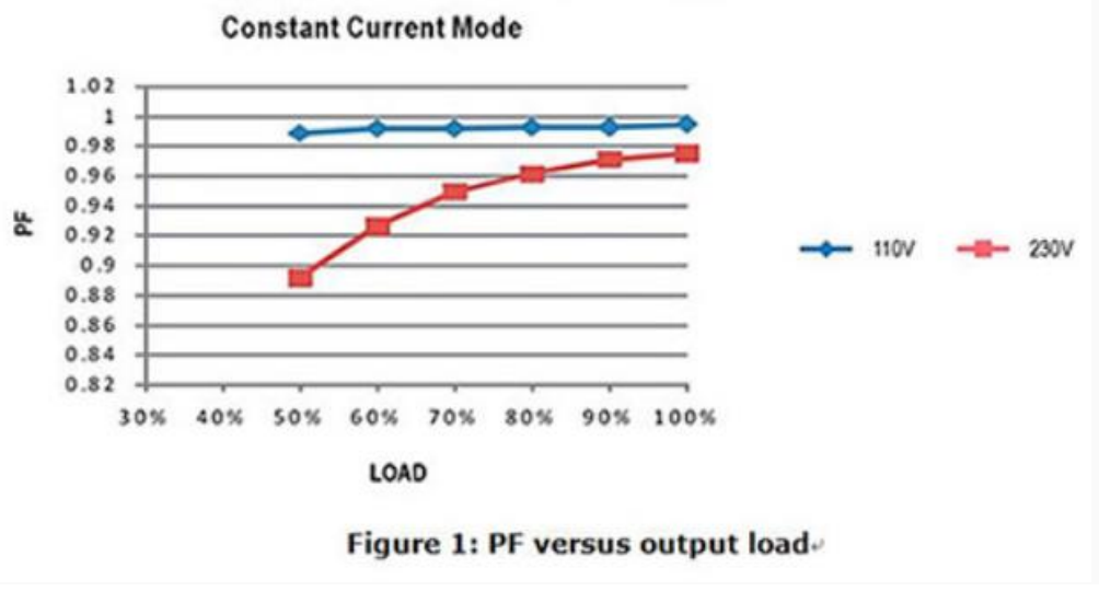 ▪ PFC 와 역률이 0.9 이상인 전원 공급장치에서는 부하용량이 PFC 사양서에 명시된 용량보다 커야 합니다. PF(역률)와 출력부하와의 관계는 그림(1)이 보여주는것과 같습니다. 일반적으로 75% 이상의 부하가 필요합니다.