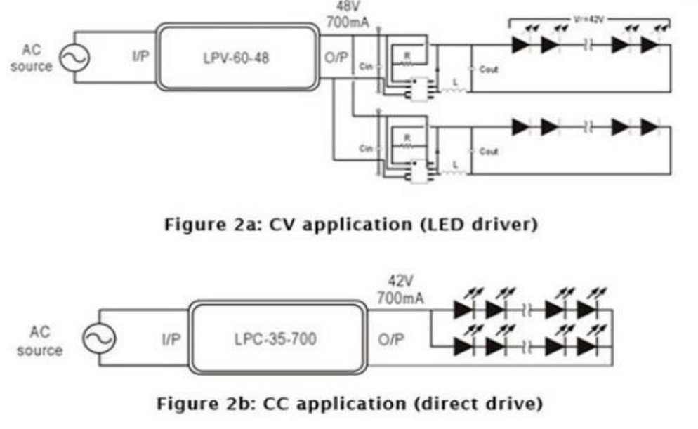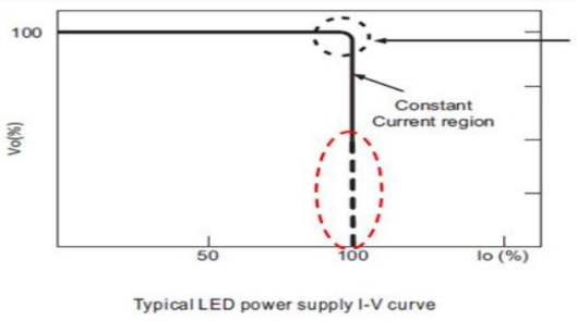 LED 상품규격서에는 V-I 특성 곡선이 모두 존재합니다. 곡선 설명에 의하면“정전류"와 “정전류+정전압” 두 종류로 나눌 수 있습니다. 정전류 모델은 LED 에만 적합하지만, 정전류+정전압모델은 LED 및 일반적으로 사용하기 적합 합니다. LED 에 적합하지 않은 부분은 점선라인으로 표현되고 있으며, 보호방식에 따라 HICCUP 모드와 정전류모드로 나눌 수 있습니다. 만약 고객이 단락 상태에서 매우 높은 전류값이 생성되지 않기를 바란다면 HICCUP 모드의 기능을 가진 모델이 선택하셔야 합니다.