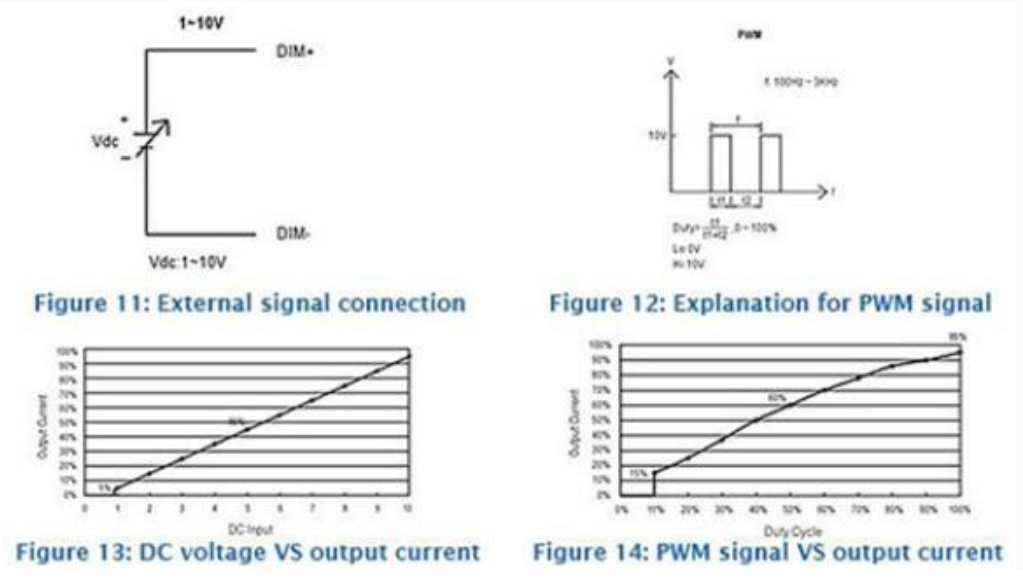 그림(11)&(12)에 보여지듯이, “DIM+”와 “DIM-”이 외부 신호를 적용할 수 있으며, 그 신호는 직류전압제어 (D Type)혹은 PWM 제어신호(P Type)등이 있으며, 아래에서 보듯이 신호레벨을 변화시키어, 사용자가 출력 전류 범위를 조절할 수 있습니다. 이 제어신호와 출력전류는 비선형이며, 오차를 가지기 때문에, 정확도를 필요로 하지 않는 조광제어에 사용하실 것을 제안합니다.