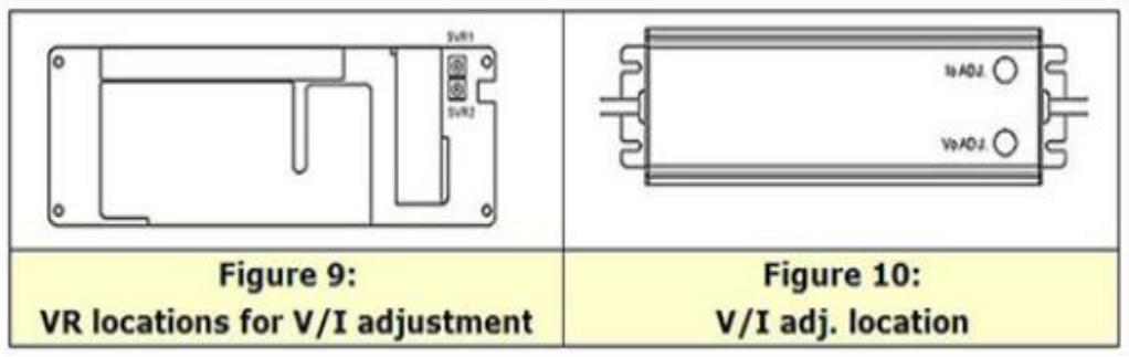 출력전압/전류를 조절 해야하는 경우, 표 1“민웰 LED 전원 공급장치 제품 비교표“의 V/I 허용되는 조정범위를 참고하여 LED 전원 공급장치를 선택할 수 있습니다. 조정범위는 제품사양서를 참고하여 주십시오. 민웰 LED 전원 공급장치의 출력전압, 전류의 미세조정은 내부의 가변저항 조정을 통해서 가능합니다. PLN 과 ELN 시리즈경우 내부의 SVR1/SVR2 에 접근하기 위해선 그림(9)와 같이 상단 덮개를 제거합니다. 다른 모델의 경우, 그림(10)과 같이 외부케이스의 고무 마개를 제거하여 Io ADJ, Vo ADJ 를 조정 할 수 있습니다. 조정 전압/전류 후에, 총 출력(전력)은 출력 정격치보다 클 수 없습니다. 또한 조정 후 상부커버와 방수 마개가 모두 올바르게 재조립 되어있는지 확인해야 합니다.