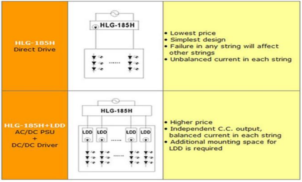 https://www.meanwell.com/product/images/led/LED_comparison_chart_en.pdf*Single-Stage 역율보정회로(PFC)를 갖추고 있는 제품을 선택한다면, 먼저 LED 전원 공급장치 사용문제(D1)의 설명을 참고하여주세요.