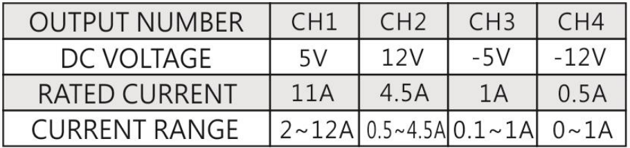 민웰의 다출력 전원 공급장치(예를들어 2 채널 출력과 같은 다출력 전원 공급장치)는 최소의 부하조건이 있습니다. 그러므로 사용전에 제품사양서를 상세히 읽어보실 것을 권장합니다. 다출력 전원 공급장치가 제대로 작동하기 위해서 각 채널의 출력에는 필요 최소 전류가 있으며, 그렇지 않을 경우 전압이 불안정해지거나 정해진 전압 오차 범위를 벗어날 수 있습니다. 이 최소 부하조건사항은 사양서의 “전류범위”에서 참조할 수 있으며, 아래 표에 표시된 바와 같이 CH1 은 최소 필요한 전류 소모가 2A, CH2 는 0.5A, CH3 은 0.1A, CH4 는 최소 0A 가 필요합니다.